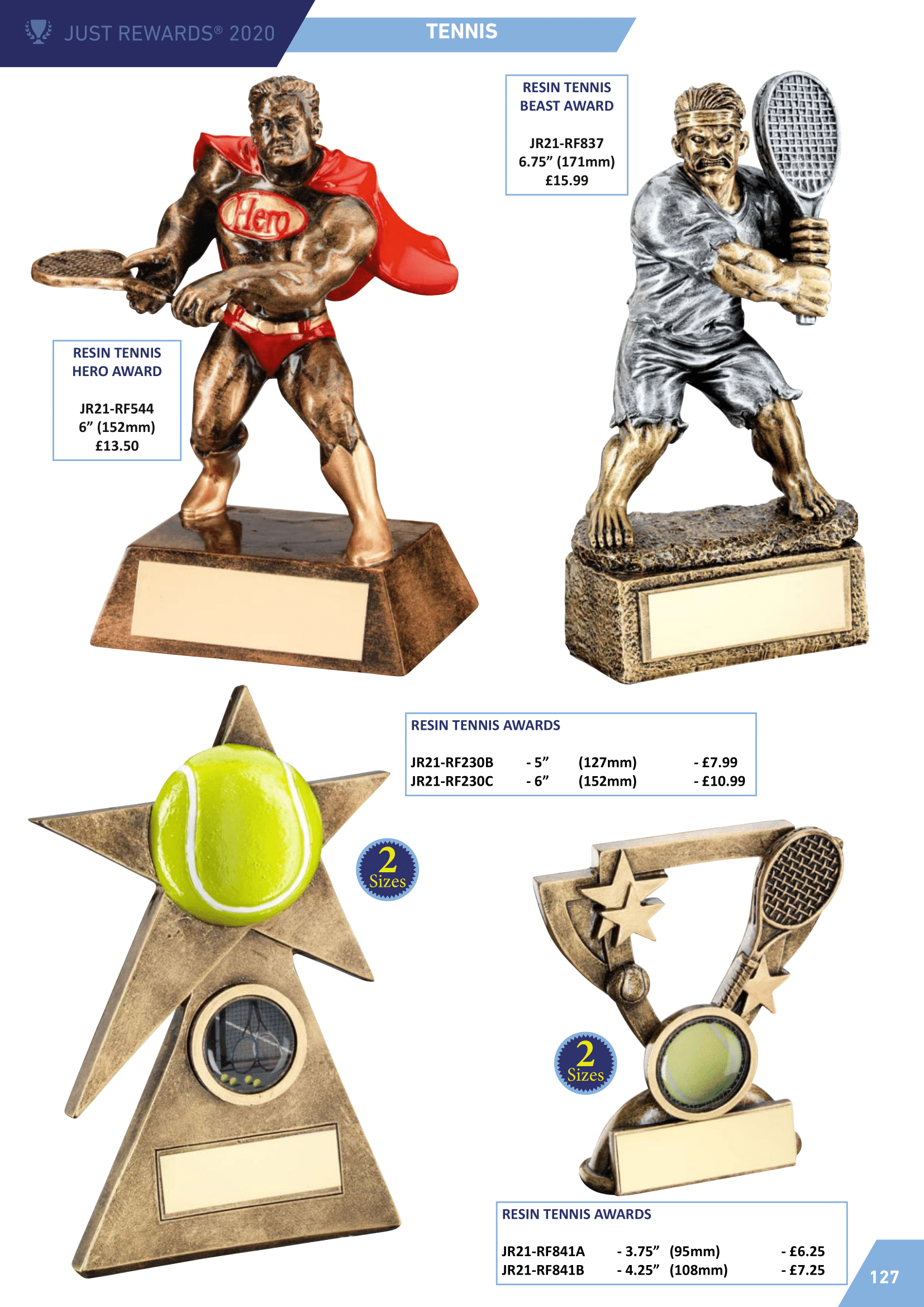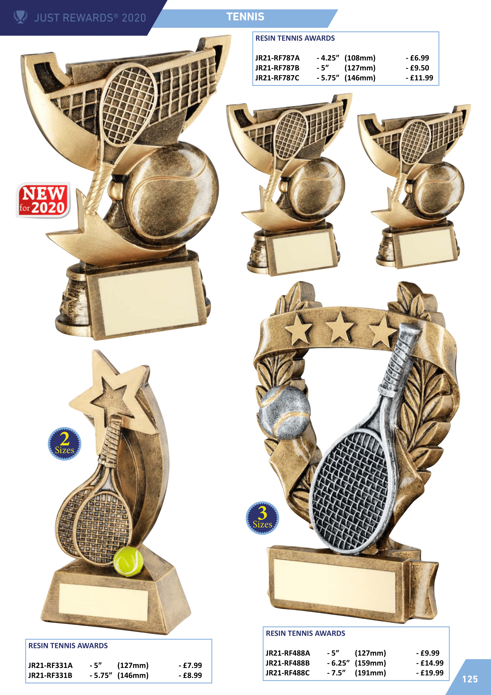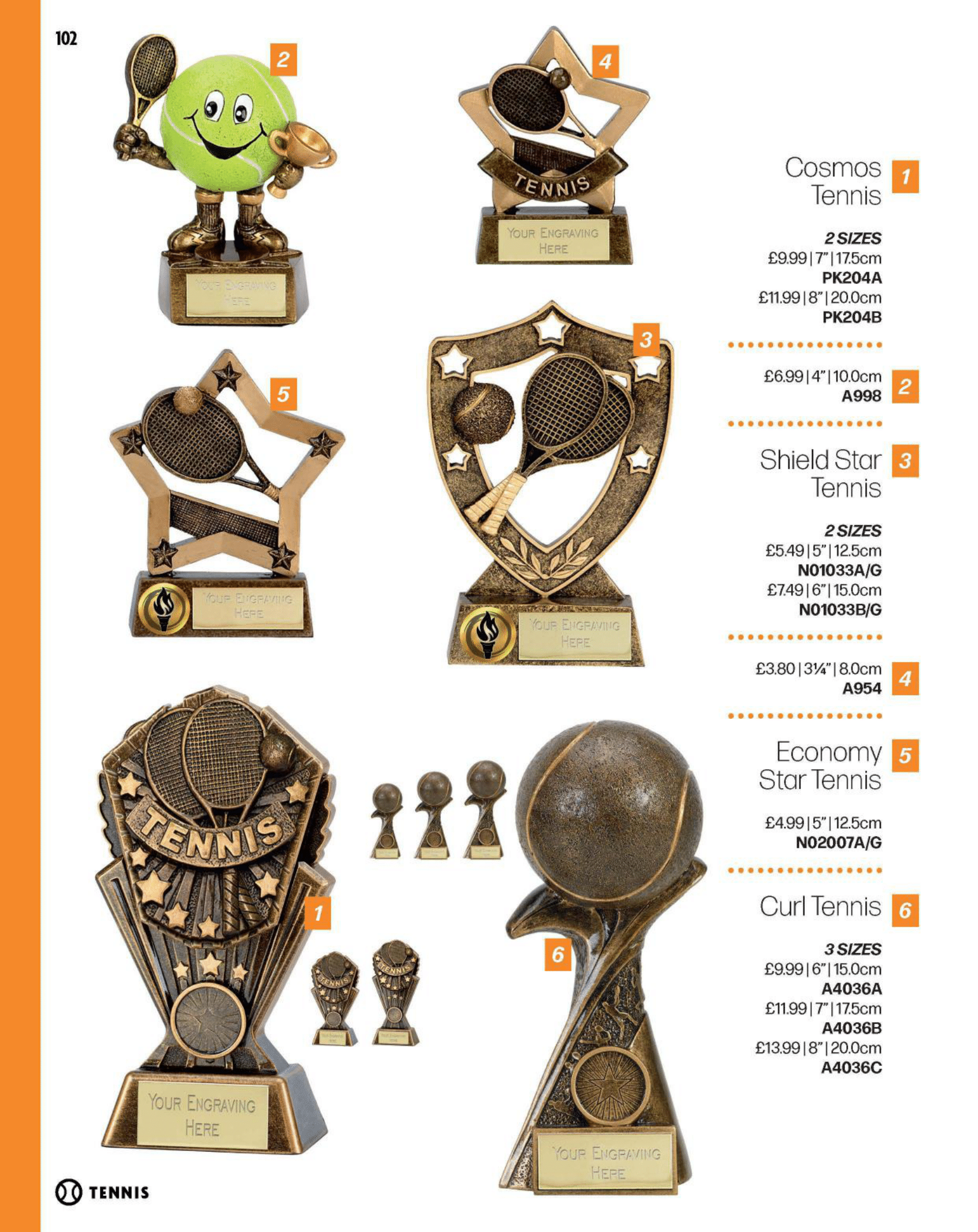 A massive choice of tennis trophies and awards. Resin players, glass tennis awards, economy tennis trophies and tennis medals.