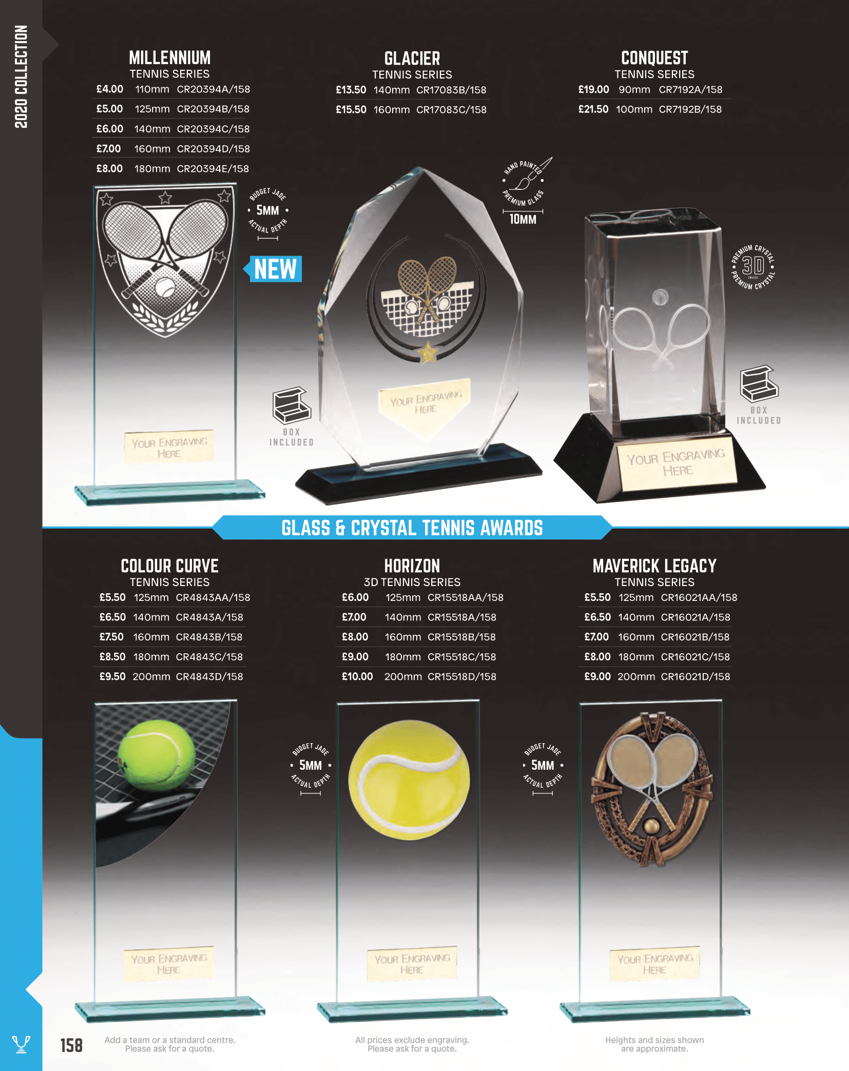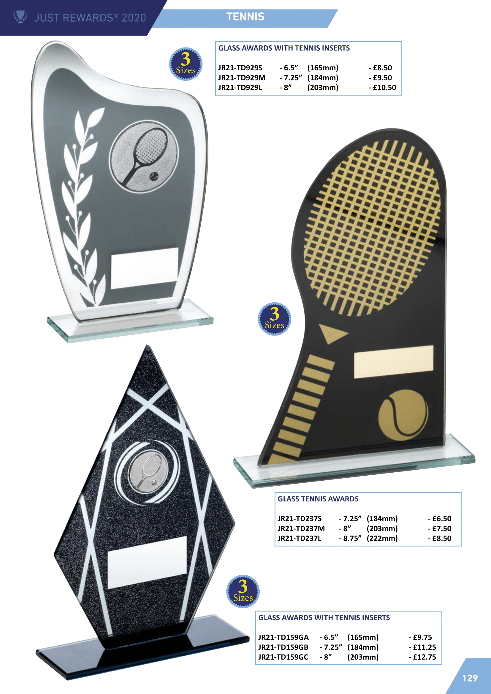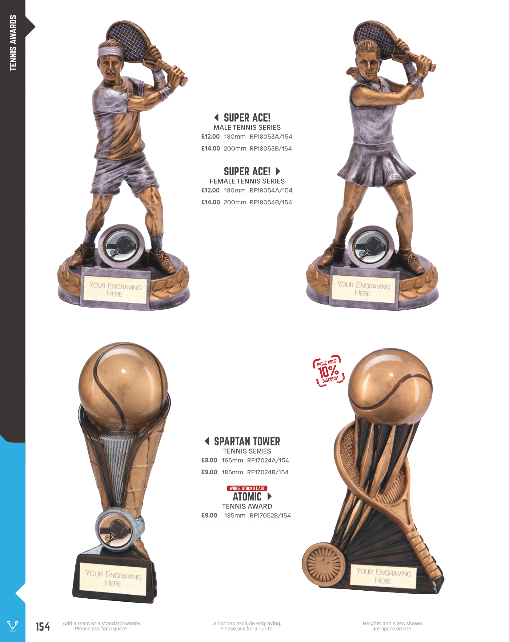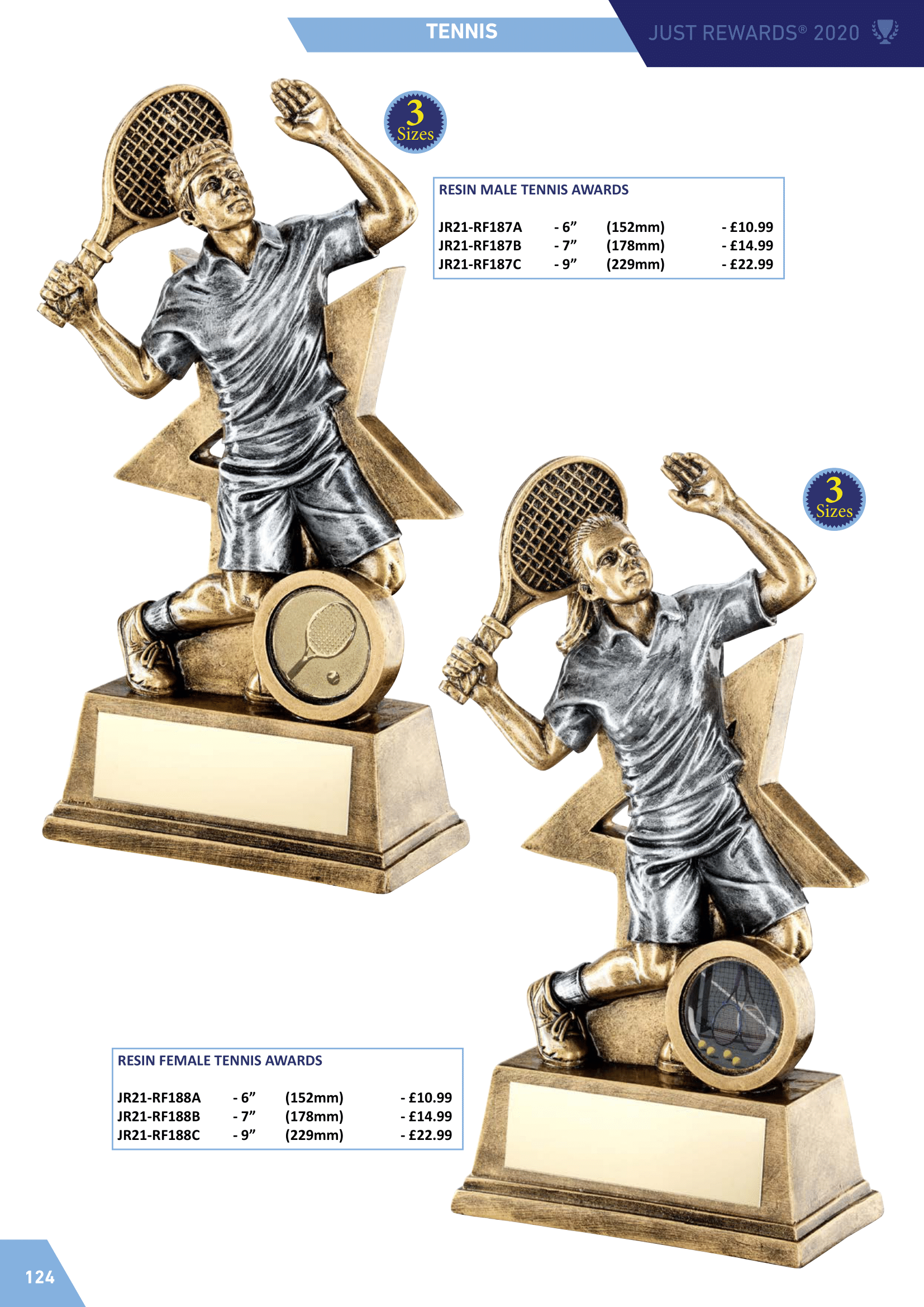 A massive choice of tennis trophies and awards. Resin players, glass tennis awards, economy tennis trophies and tennis medals.